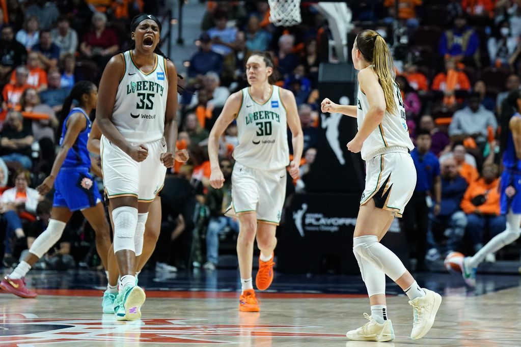 終了2分前にスチュワートが3ポイントシュートを決め、リバティが77-75とリードした。 次にコートに向かう彼女がファウルショットを2本打つと、ニューヨークのファンは「MVP」を叫んだ。